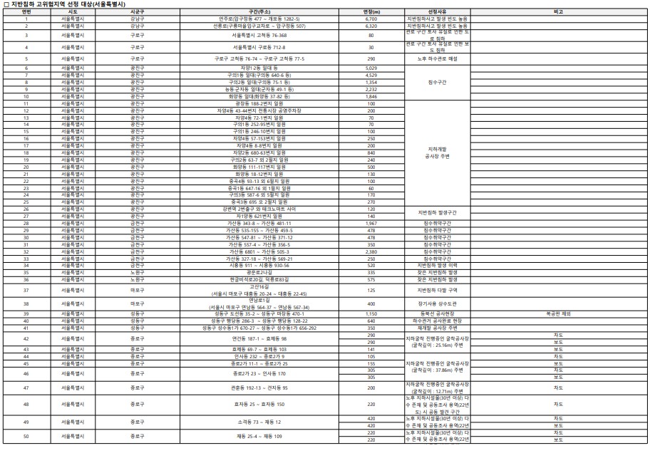 - 최근 싱크홀 사고가 발생한 강동구는 이번 리스트에 포함되지 않았습니다.